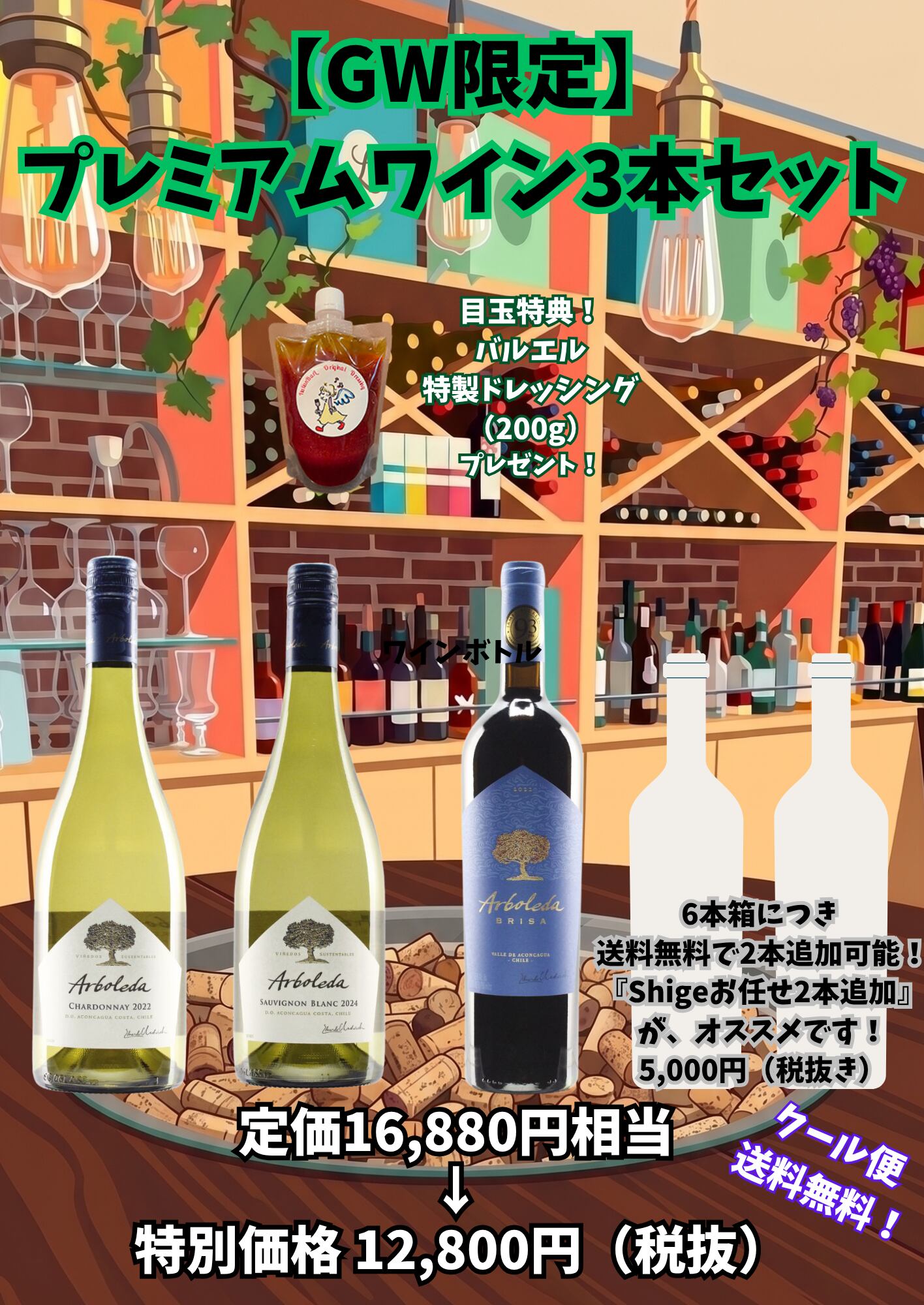 プレミアムワイン3本+特製ドレッシングセット「今年のゴールデンウィーク、おうちの食卓をイタリアンバールの特等席に。」